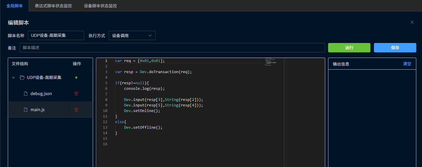 进入到【自定义设备】的编辑页面,设置【周期采集】和【控制输出】使用的脚本。下拉框中,可以选择在脚本管理中预先编辑好的脚本